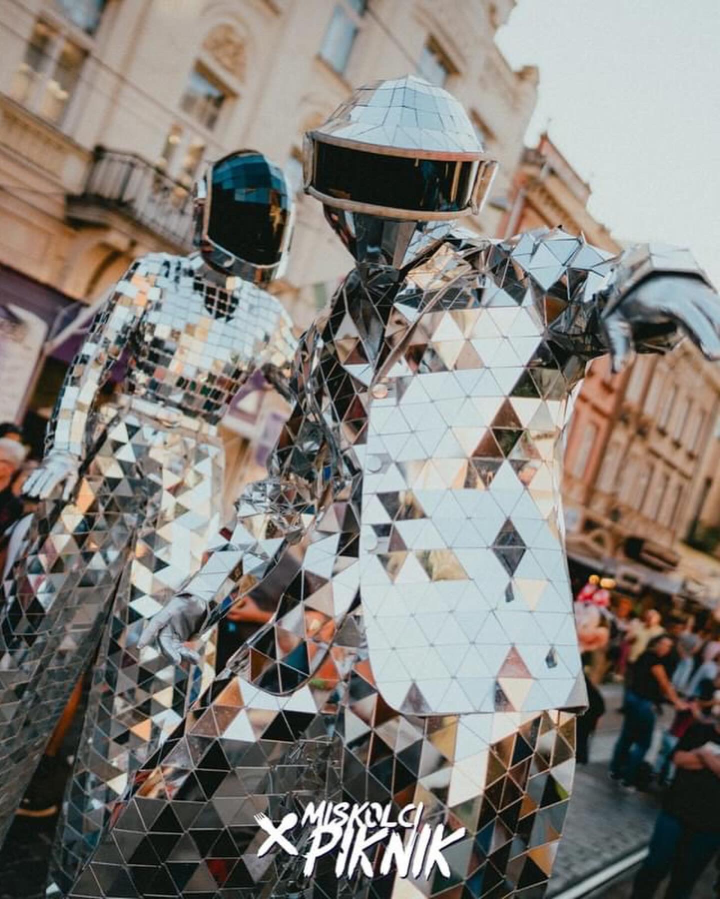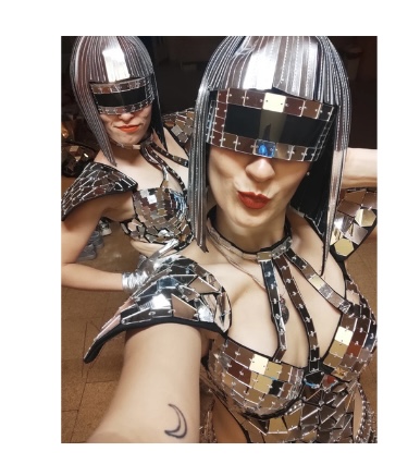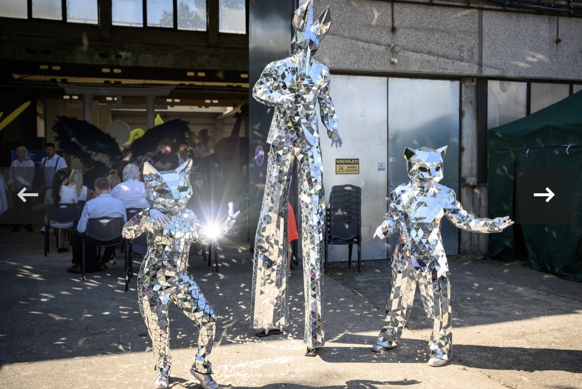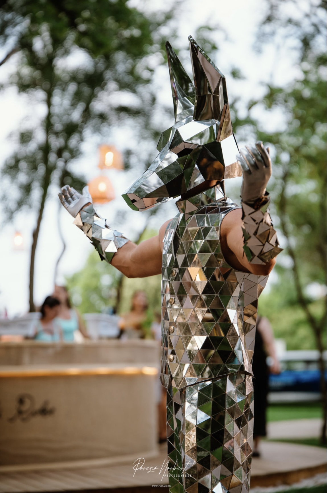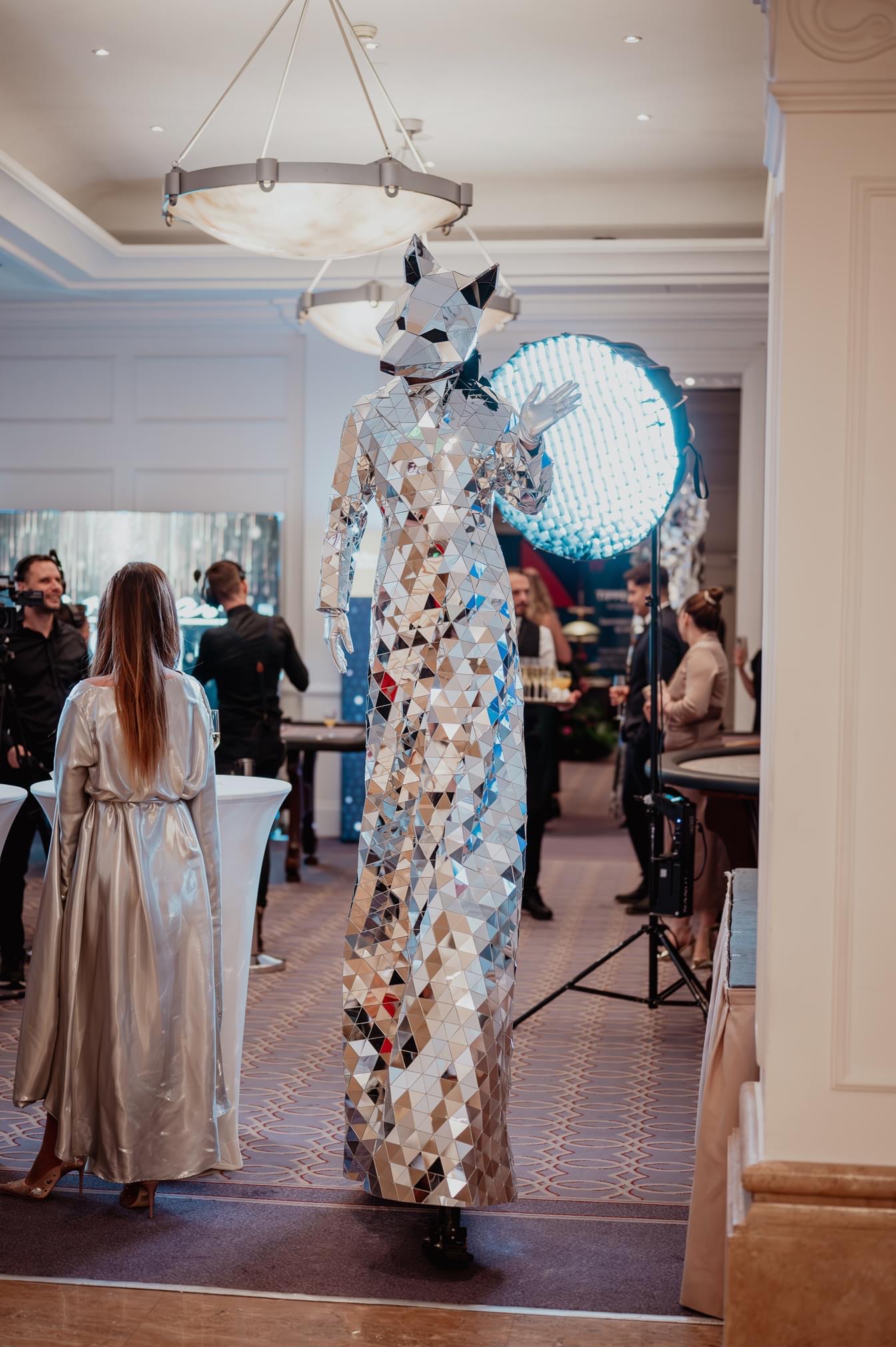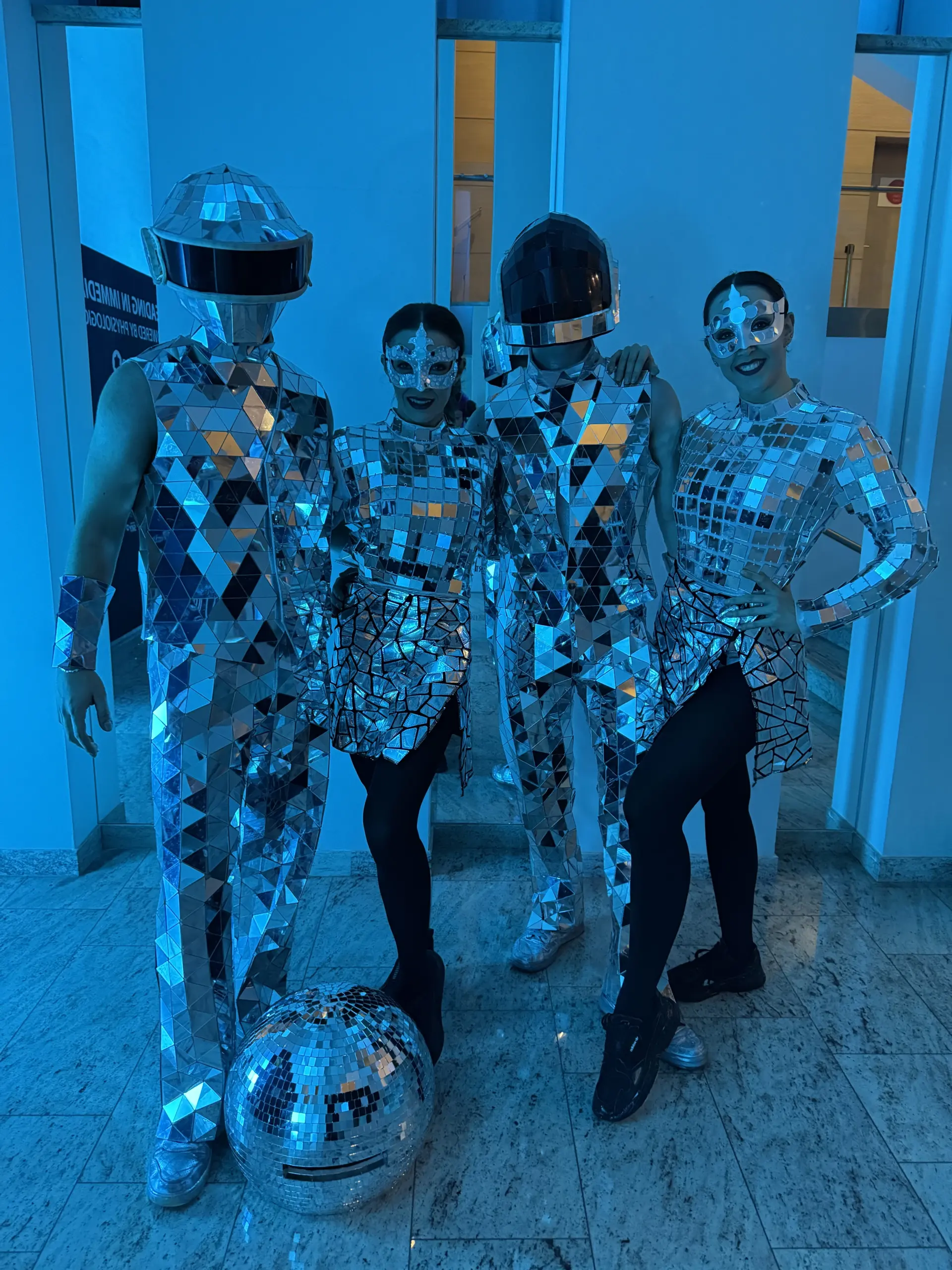 A tükrös kosztümök és a különleges megjelenés azonnal magára vonja a figyelmet, miközben egyedi, futurisztikus hangulatot teremt a rendezvényen.