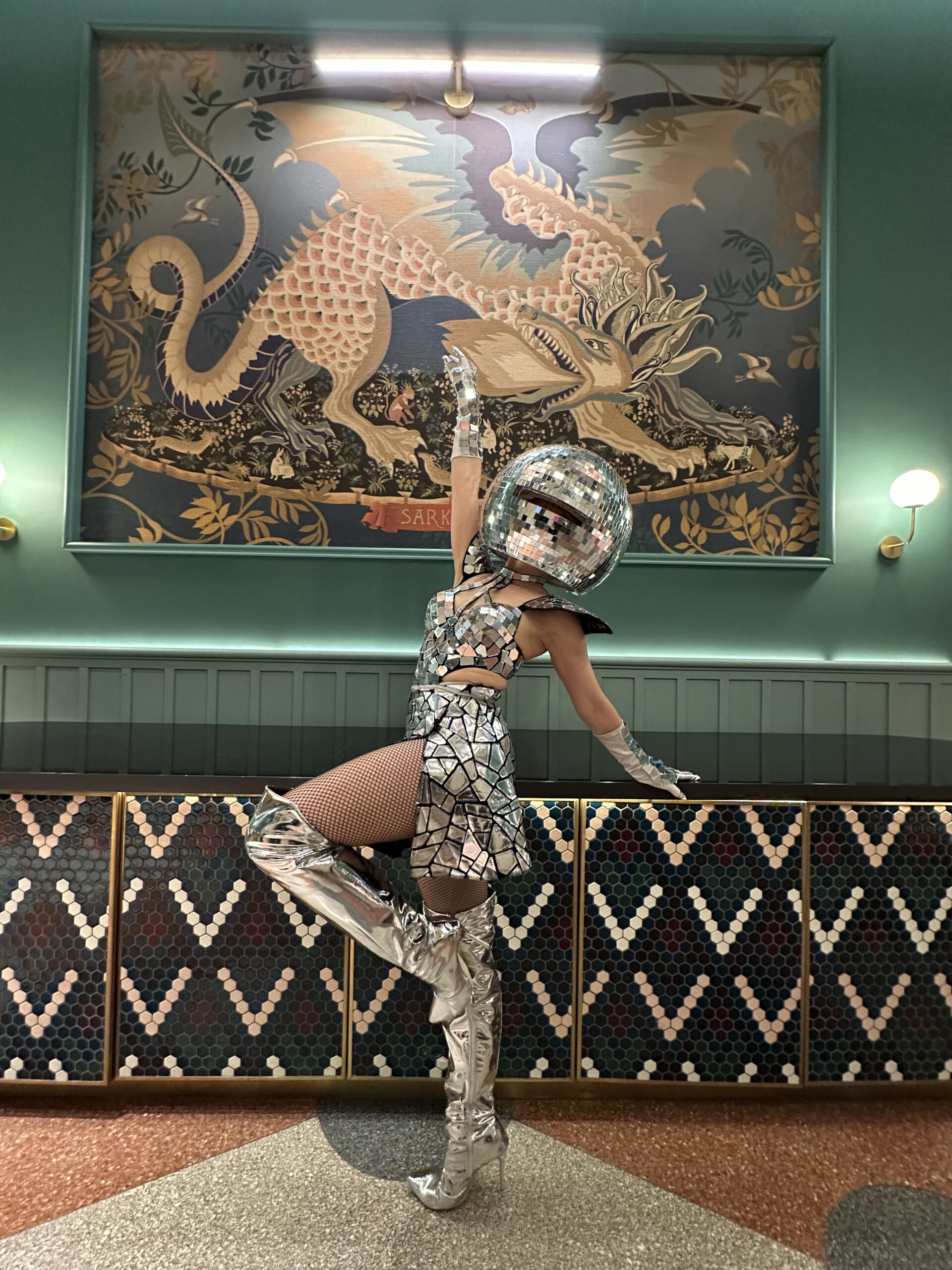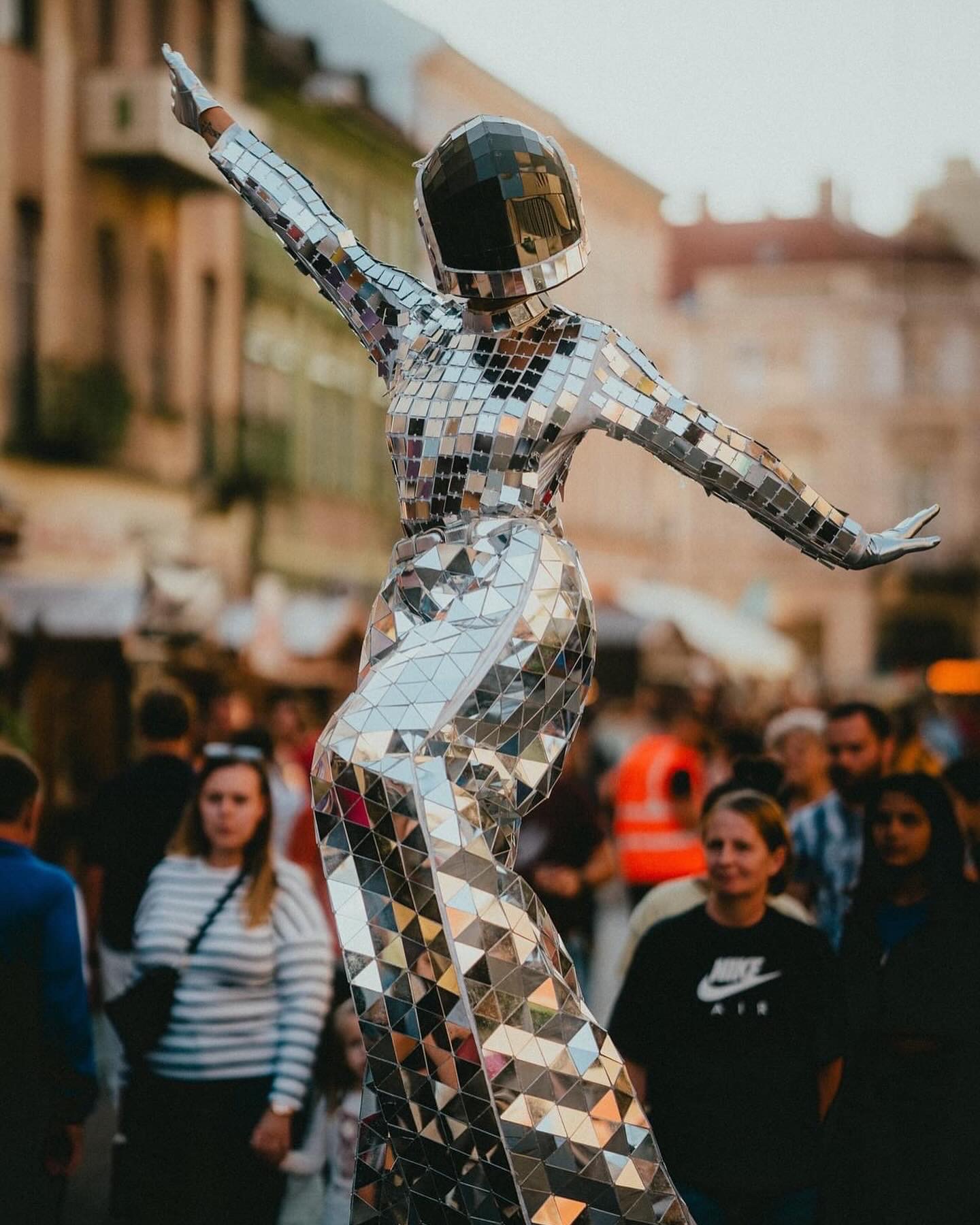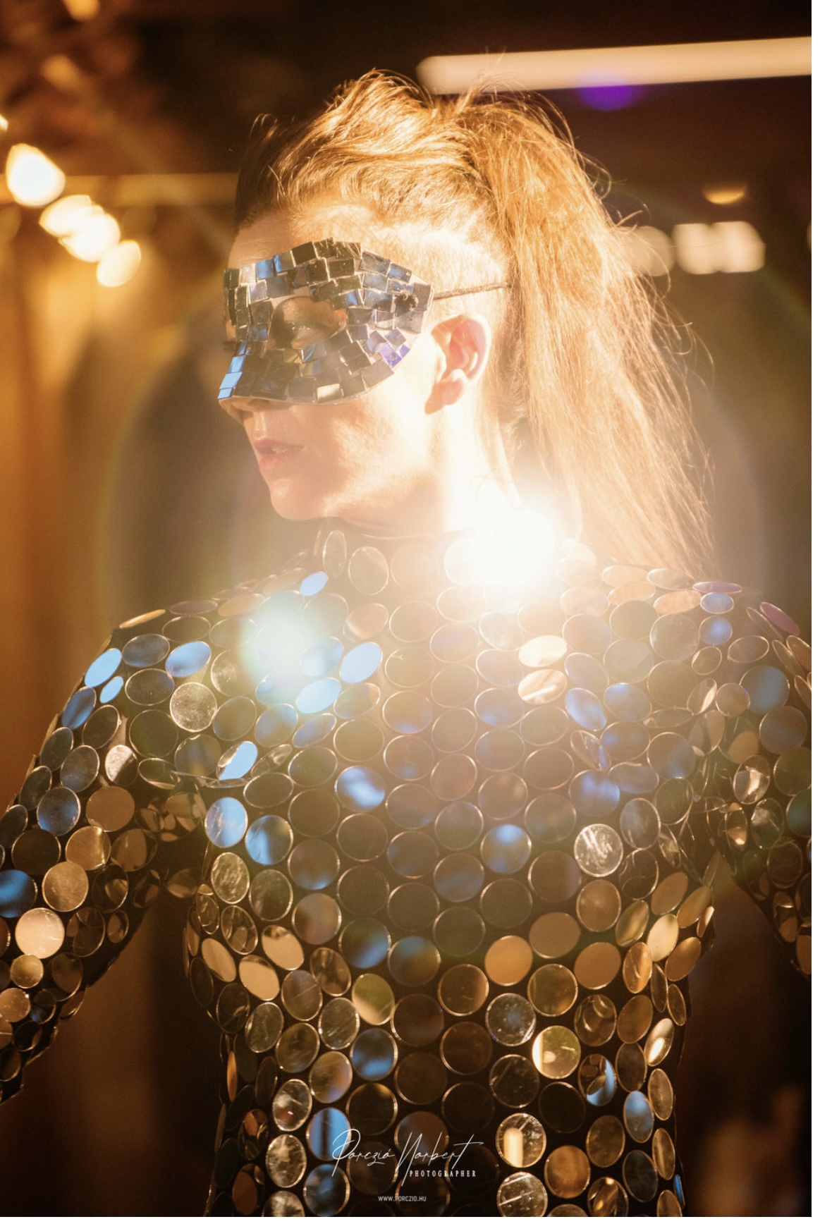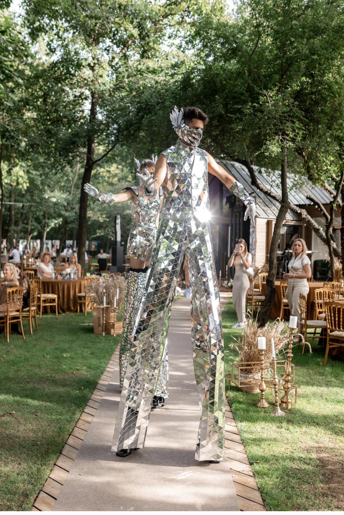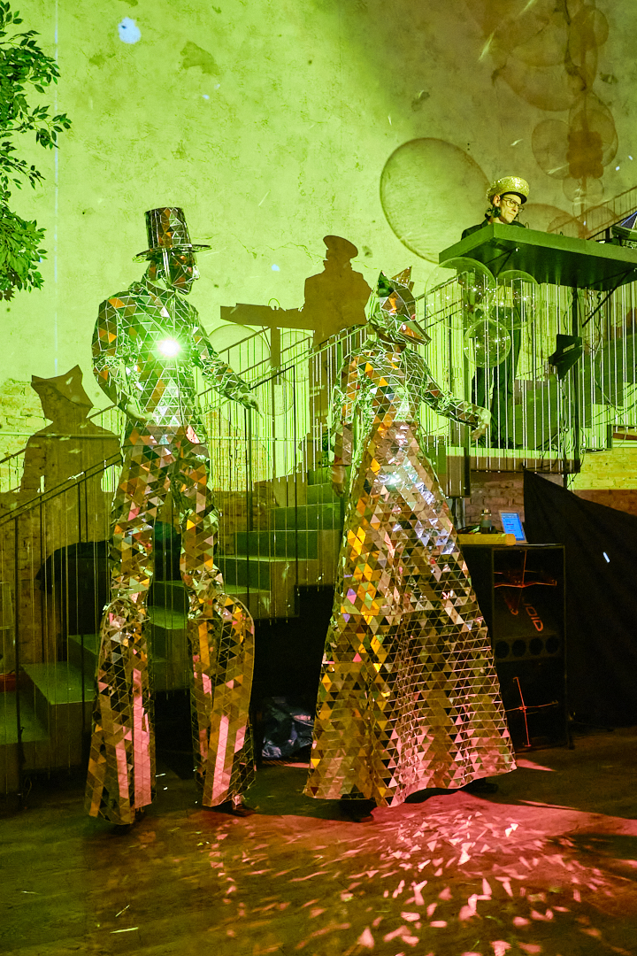 A tükrös kosztümök és a különleges megjelenés azonnal magára vonja a figyelmet, miközben egyedi, futurisztikus hangulatot teremt a rendezvényen.