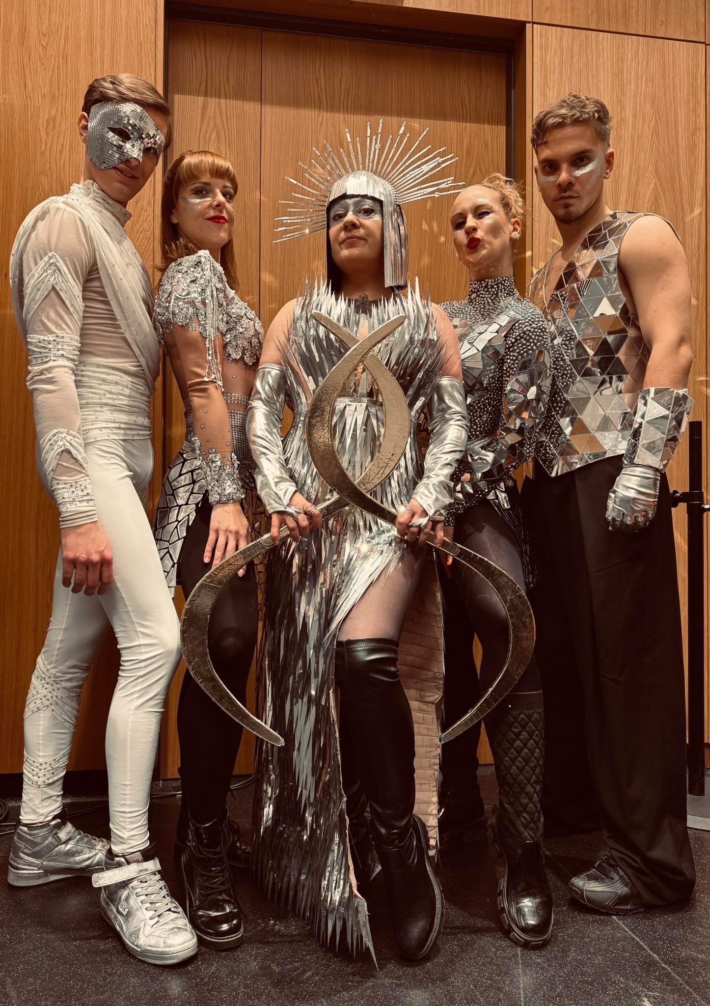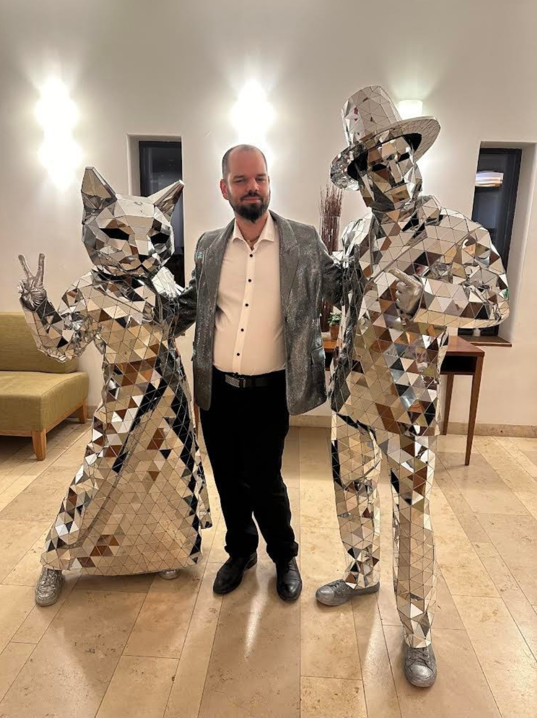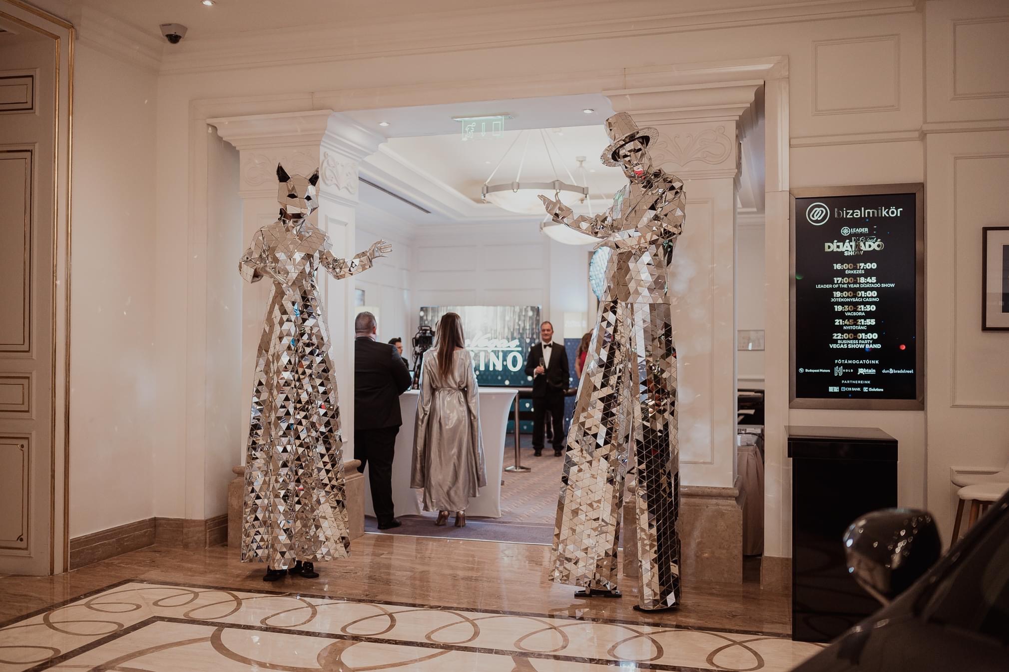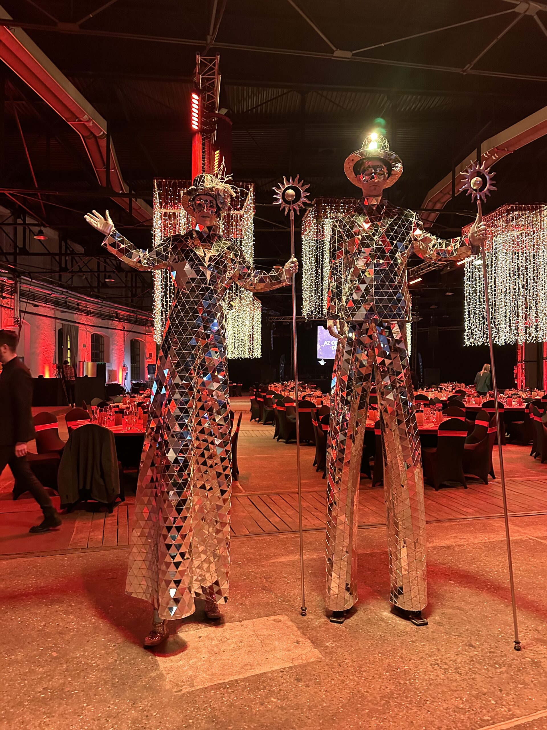 A tükrös kosztümök és a különleges megjelenés azonnal magára vonja a figyelmet, miközben egyedi, futurisztikus hangulatot teremt a rendezvényen.