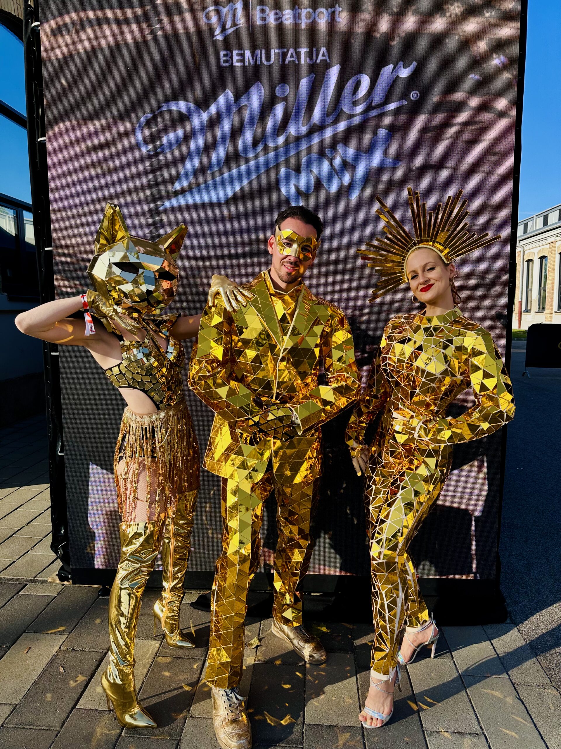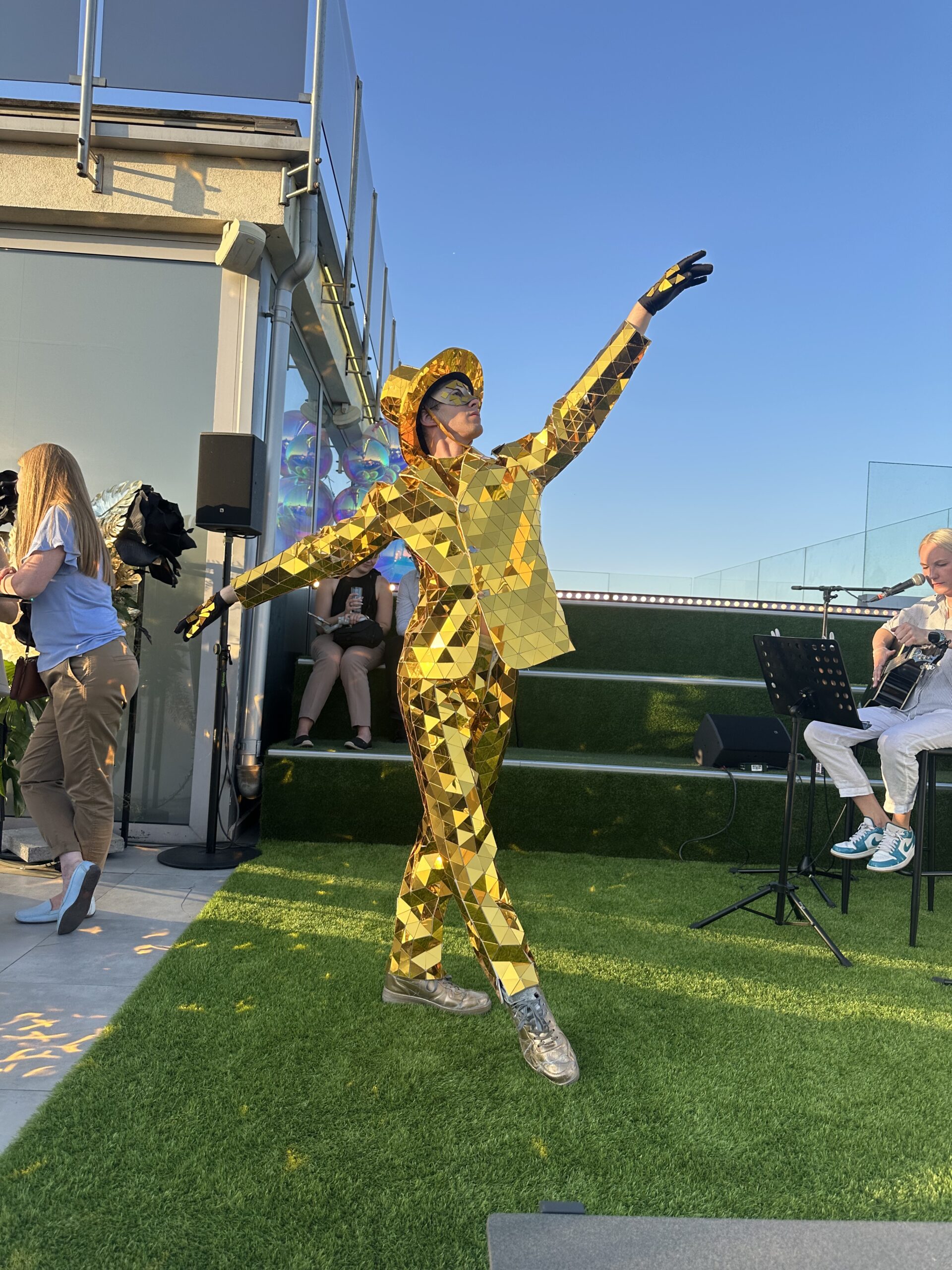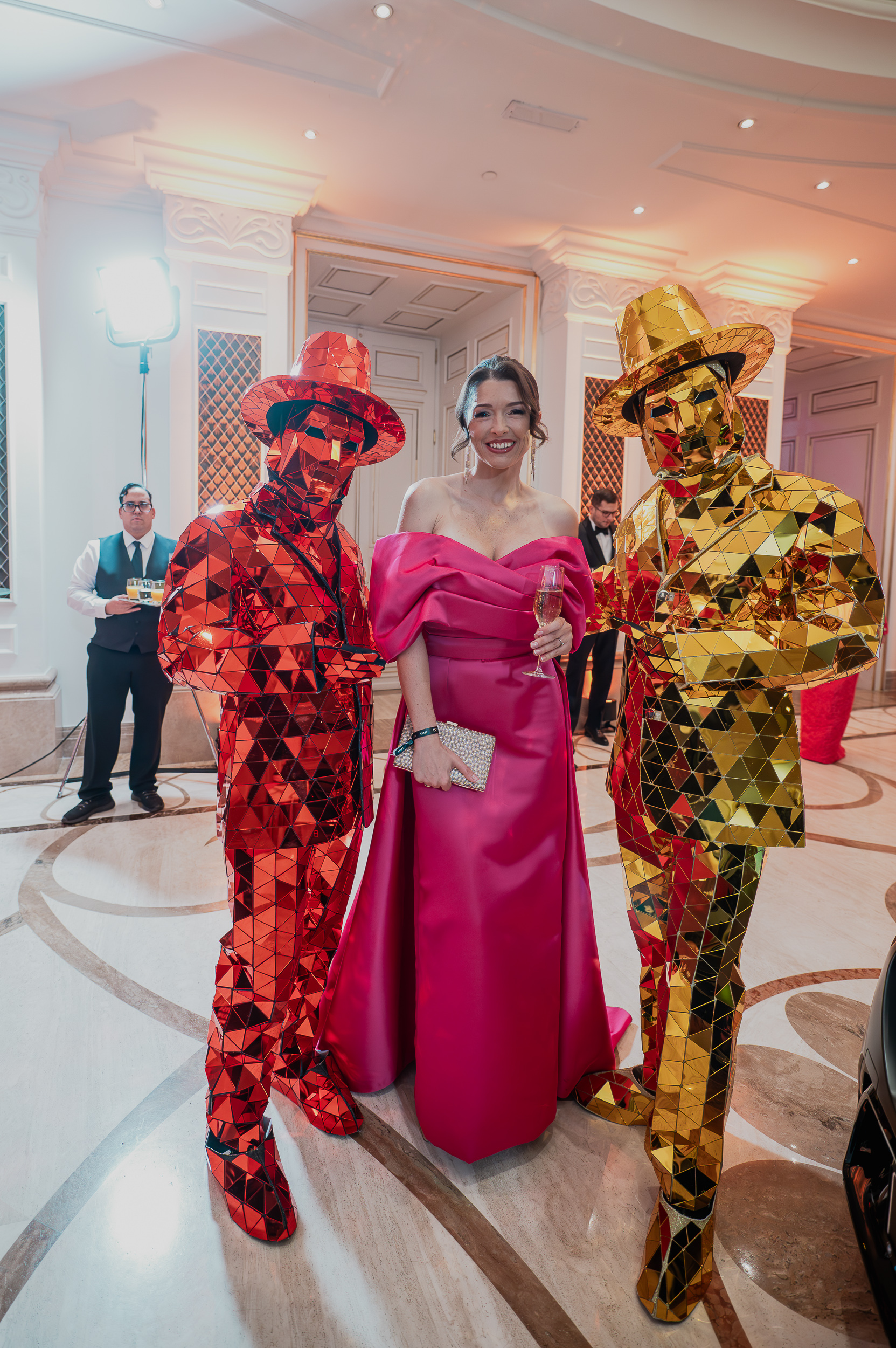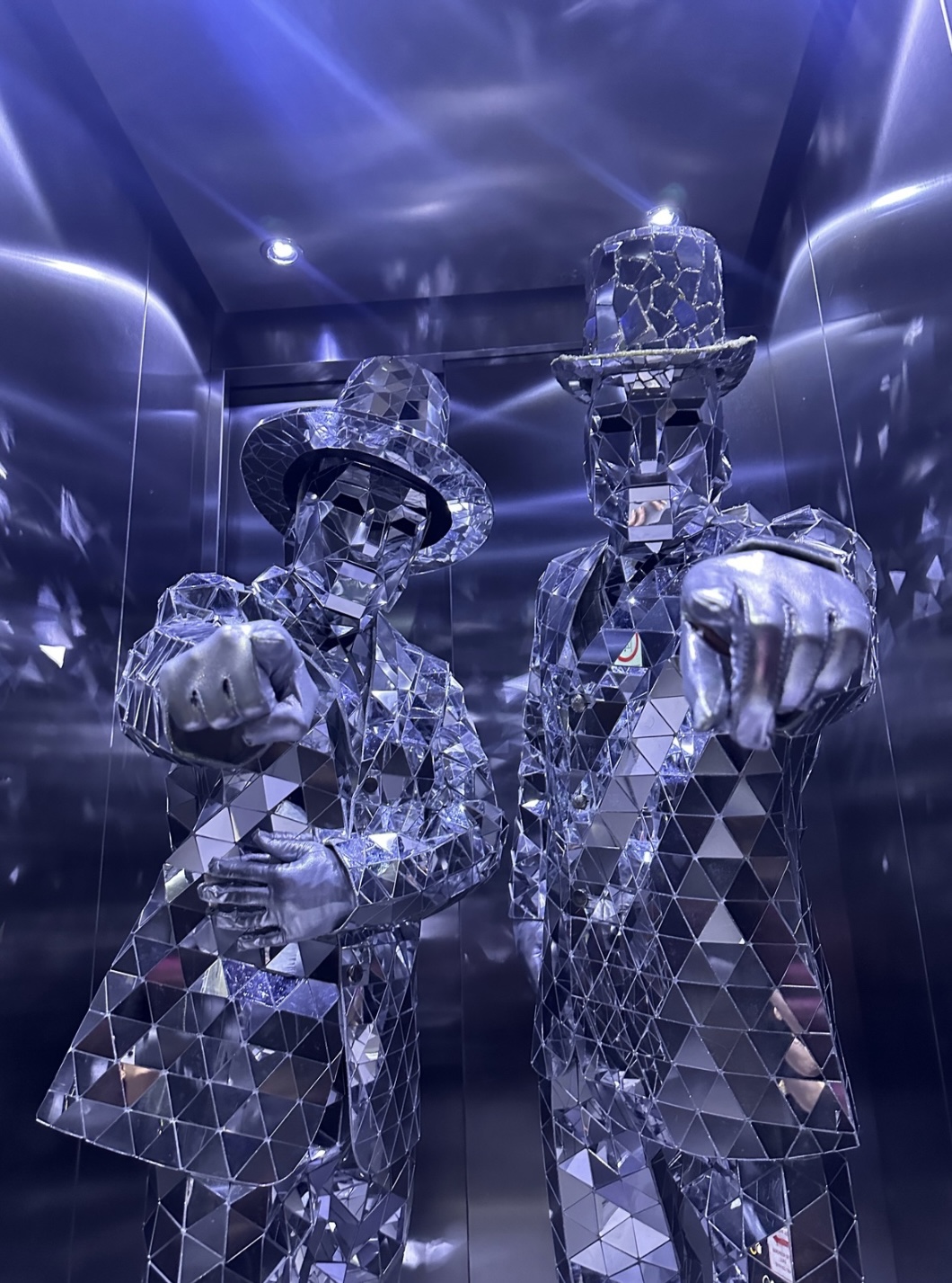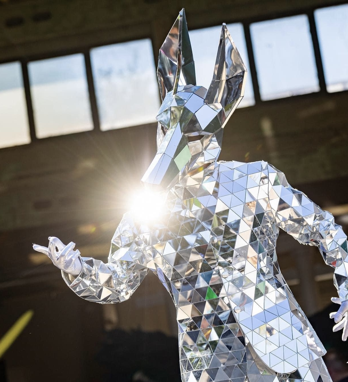 A tükrös kosztümök és a különleges megjelenés azonnal magára vonja a figyelmet, miközben egyedi, futurisztikus hangulatot teremt a rendezvényen.