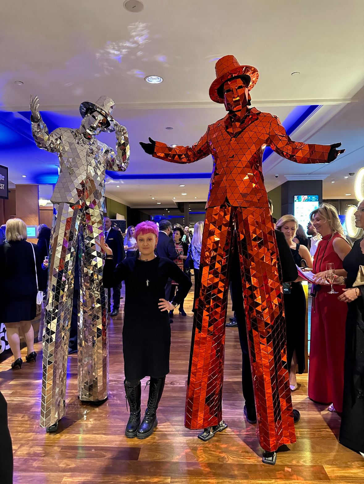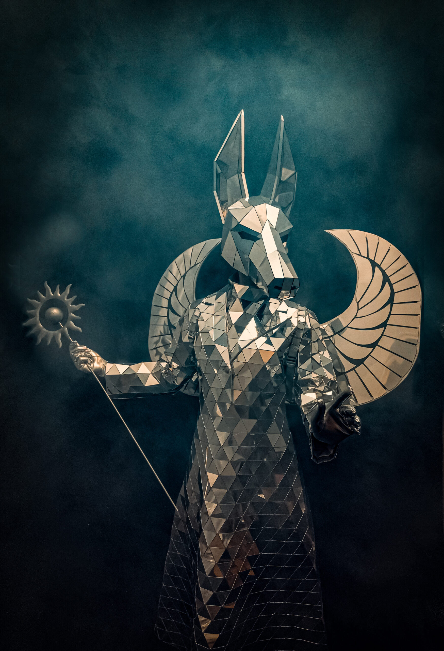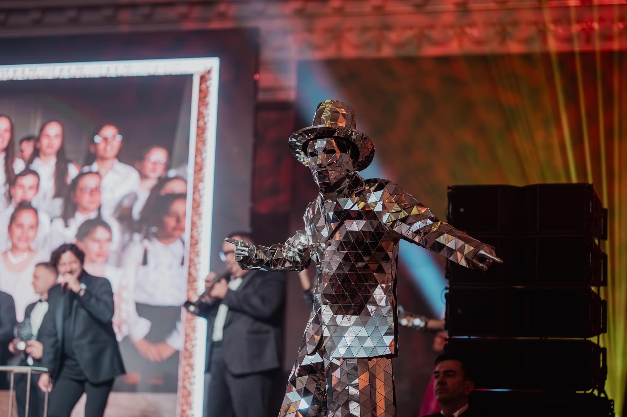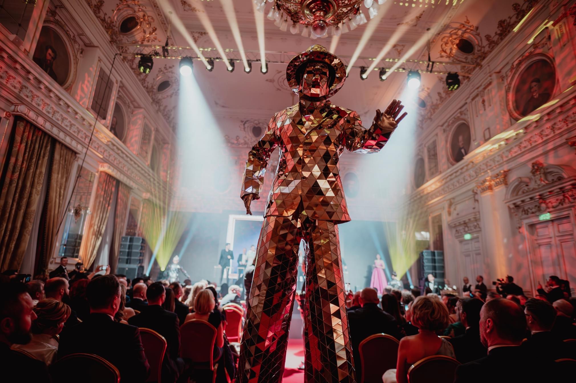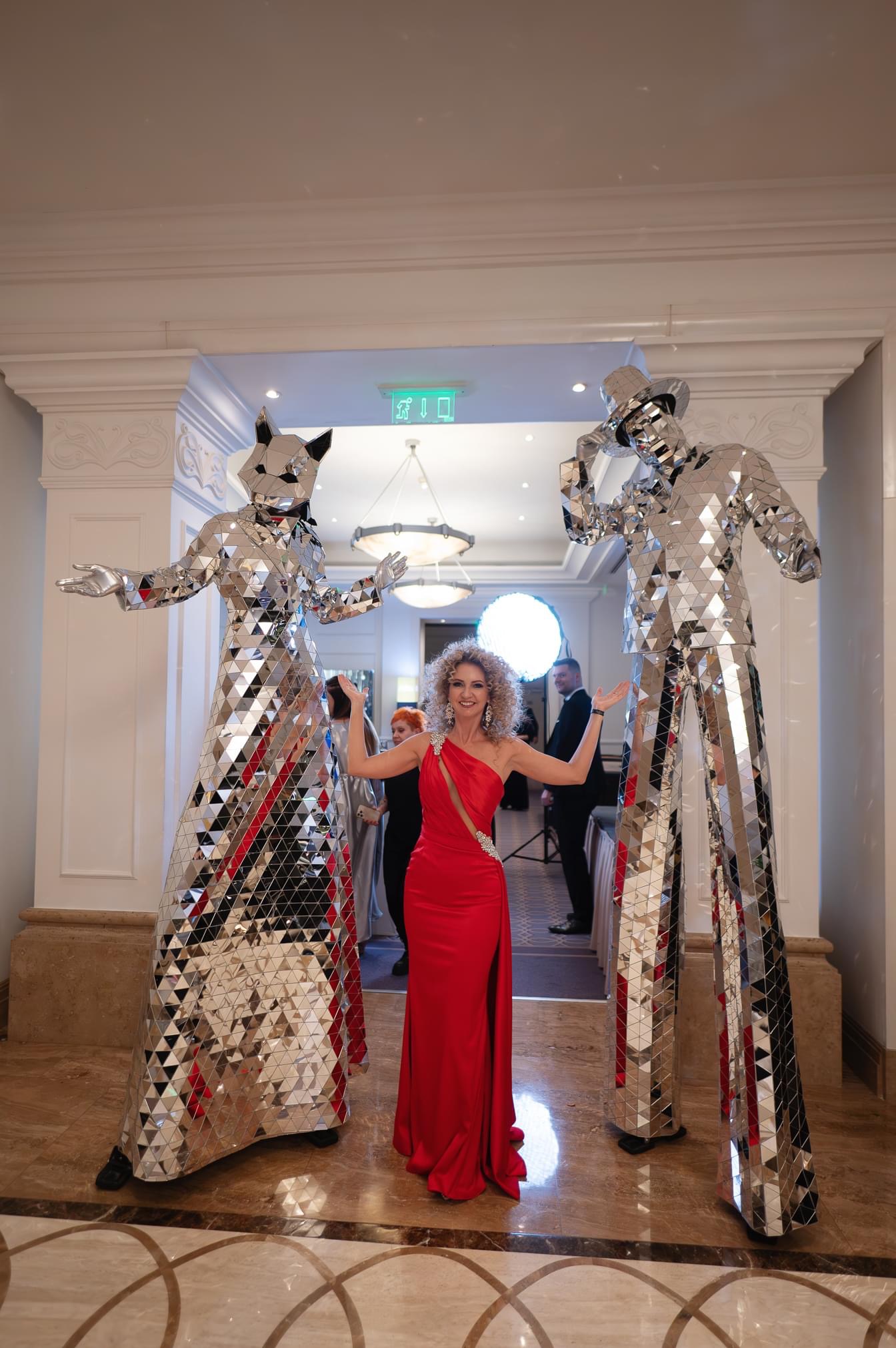 A tükrös kosztümök és a különleges megjelenés azonnal magára vonja a figyelmet, miközben egyedi, futurisztikus hangulatot teremt a rendezvényen.