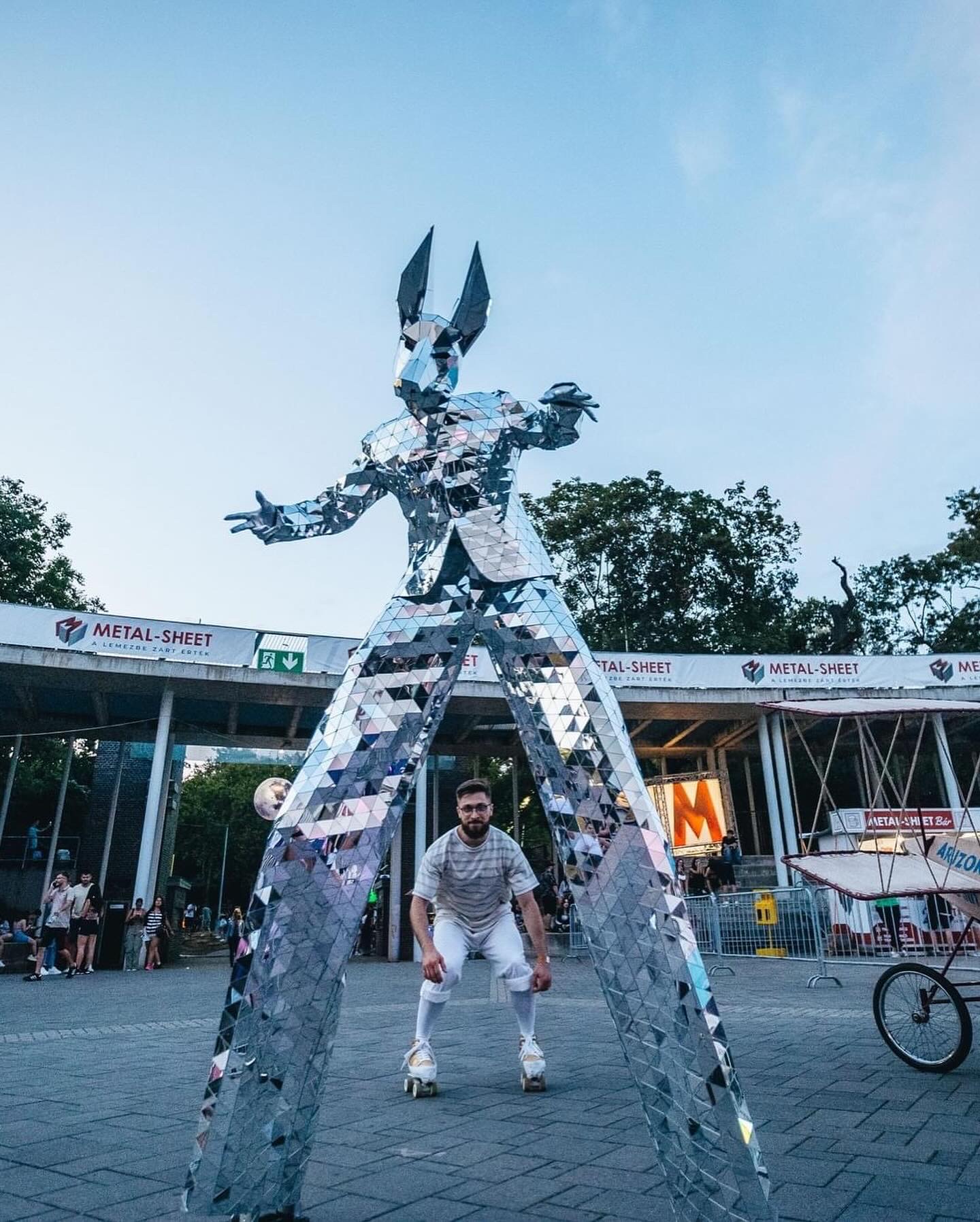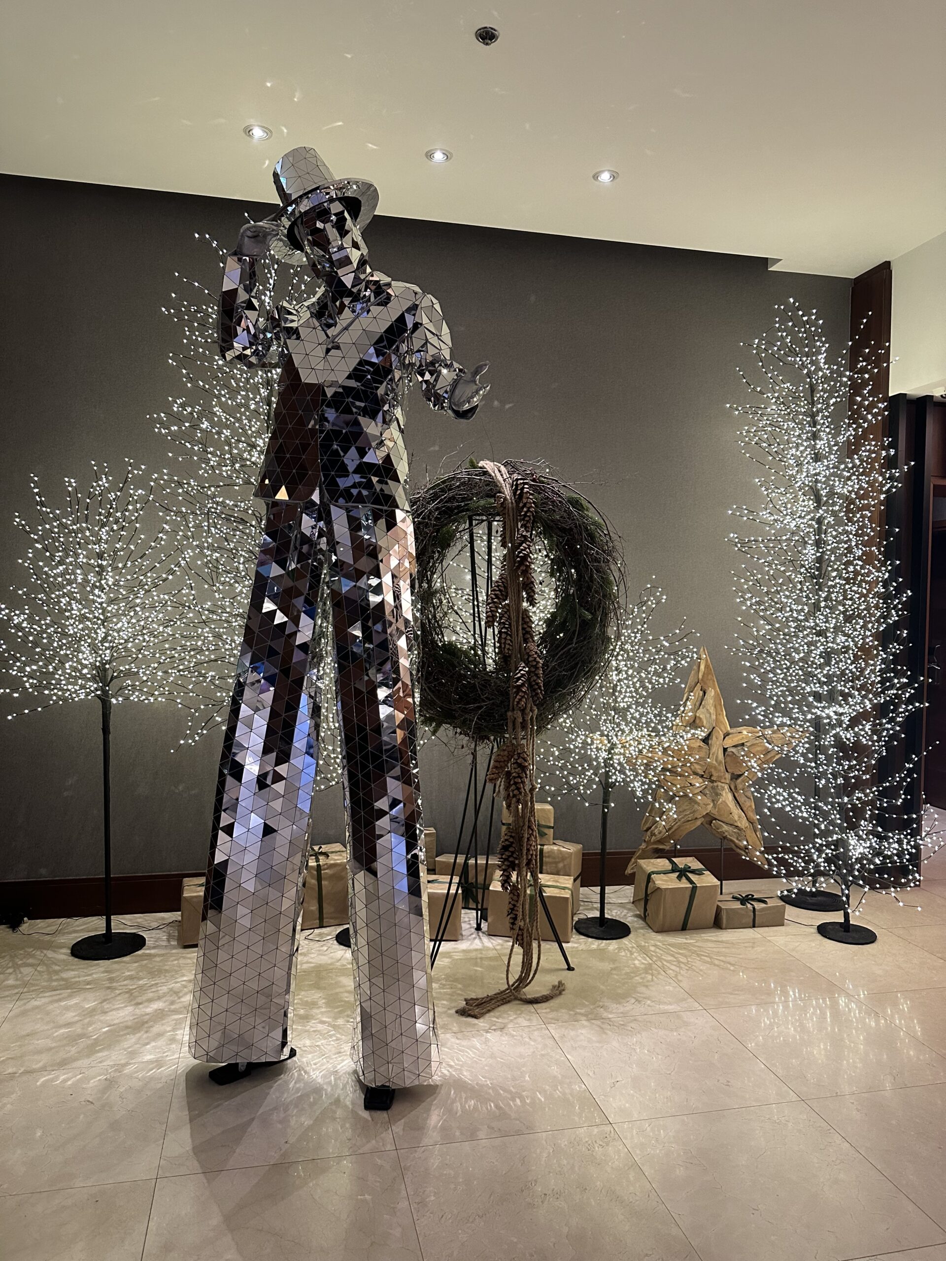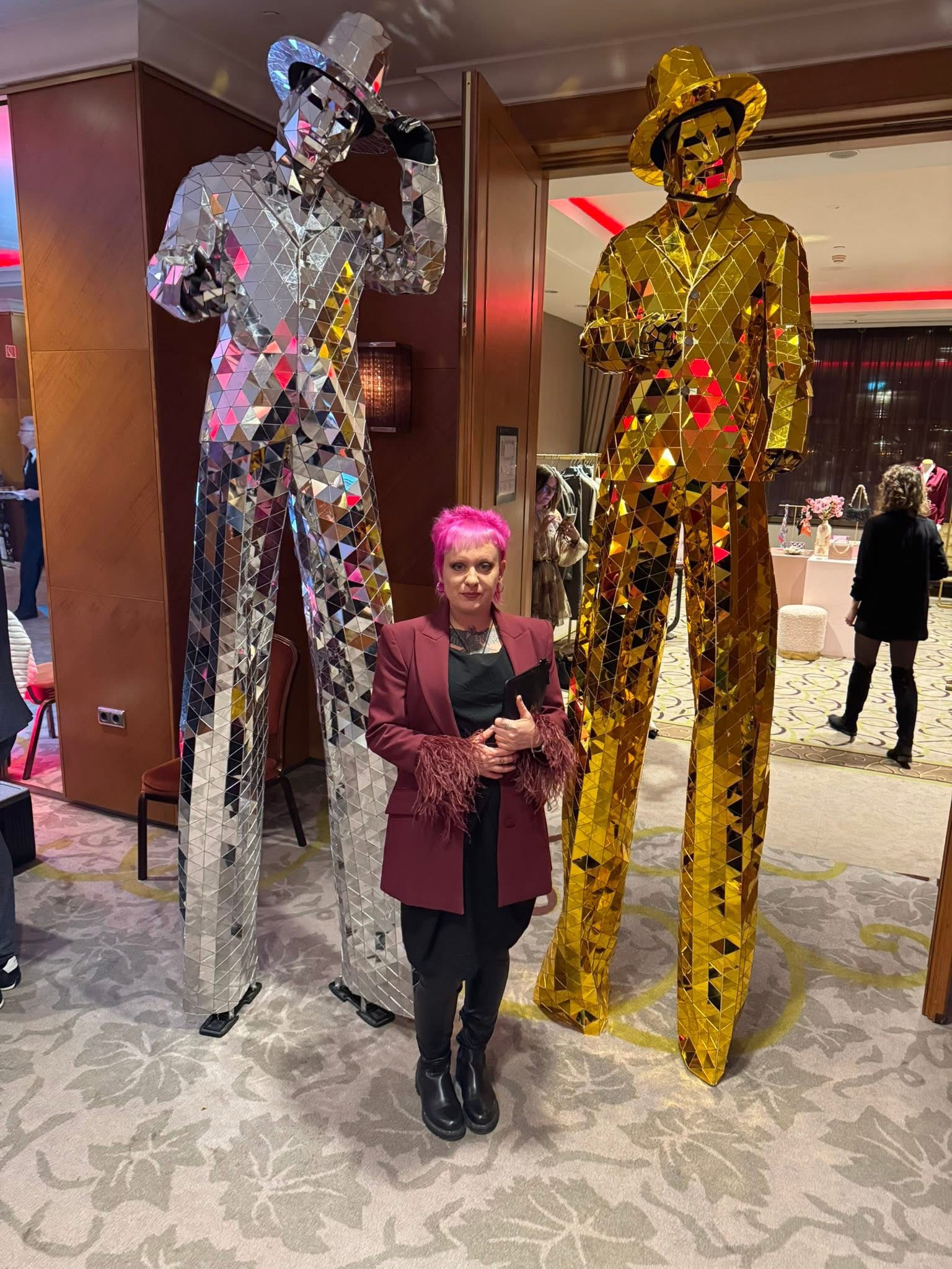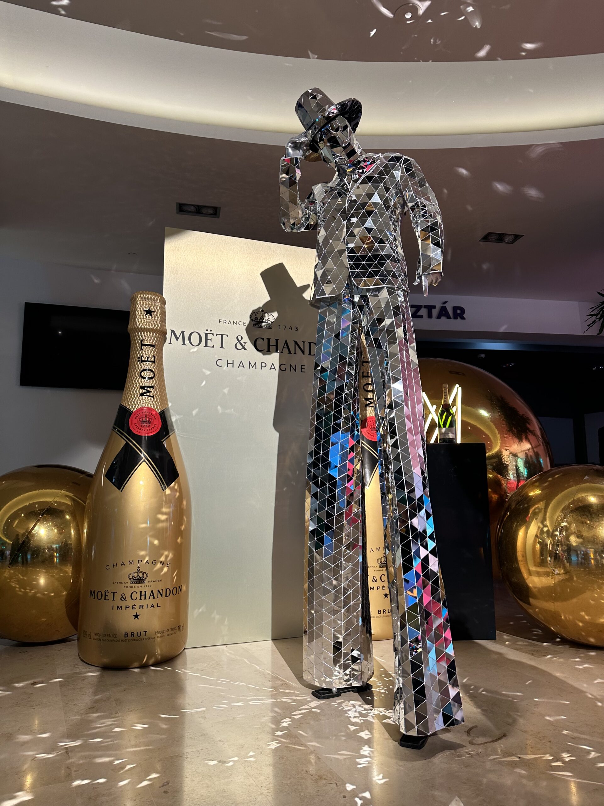 A tükrös kosztümök és a különleges megjelenés azonnal magára vonja a figyelmet, miközben egyedi, futurisztikus hangulatot teremt a rendezvényen.