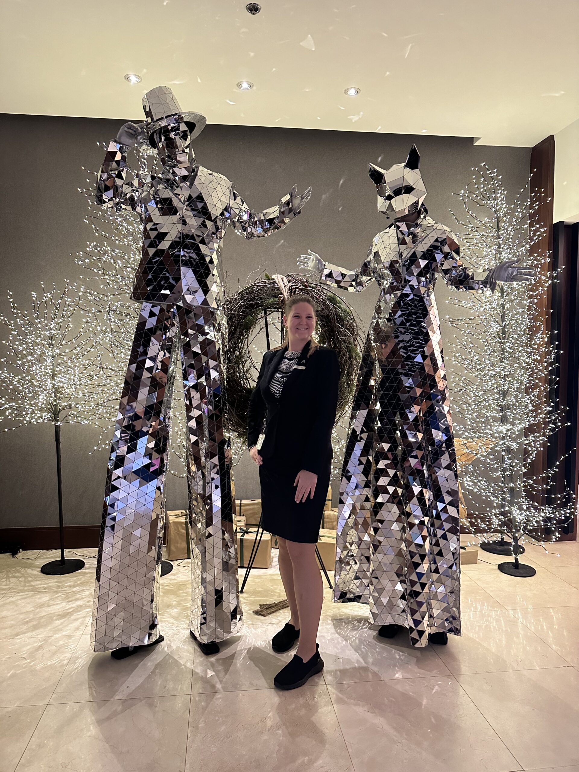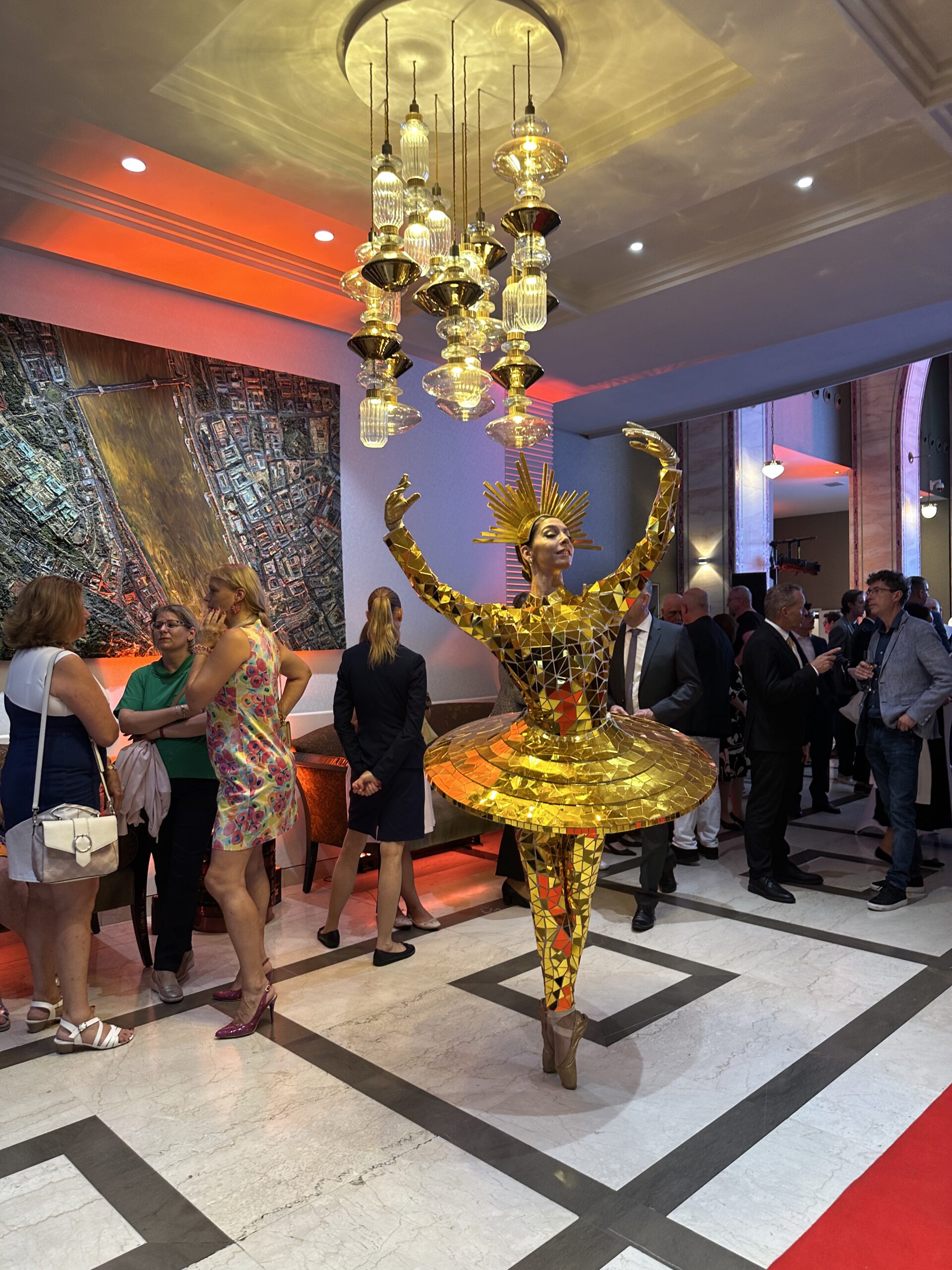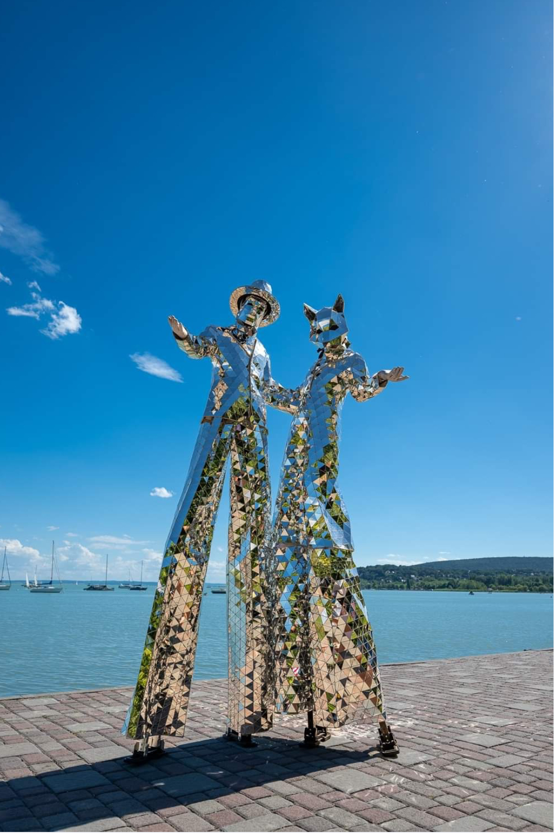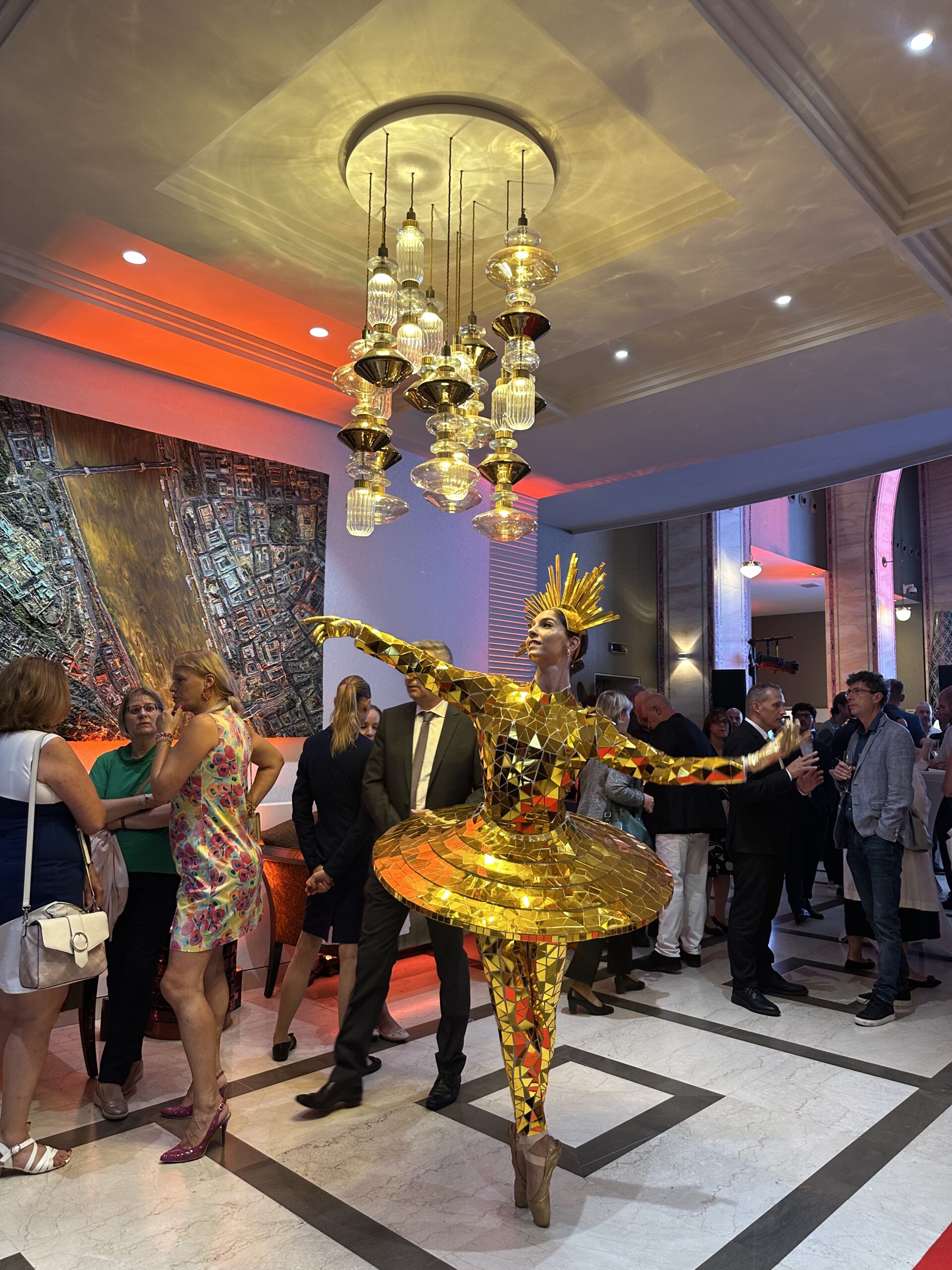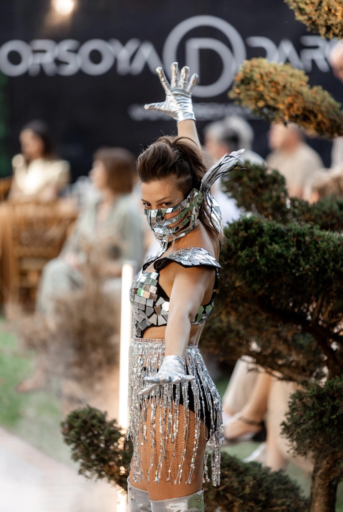 A tükrös kosztümök és a különleges megjelenés azonnal magára vonja a figyelmet, miközben egyedi, futurisztikus hangulatot teremt a rendezvényen.